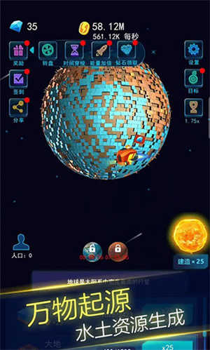 1、进入游戏,我们首先看到的就是一个光秃秃的地球,这是它最原始的样子,在建造页面,我们就可以花费金币来建造水资源和大地资源,后续还将解锁泥土等资源。