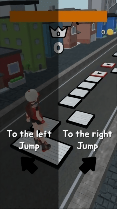 2、游戏操作界面,彩色箭头方块提示方向,屏幕下方用红字标明向左跳和向右跳的操作提示。